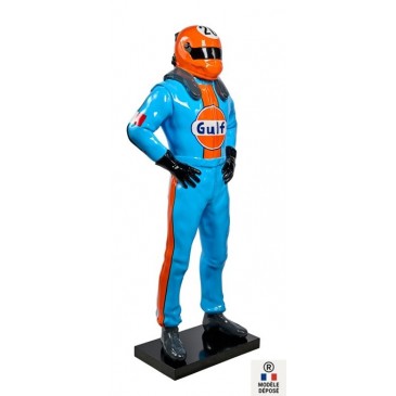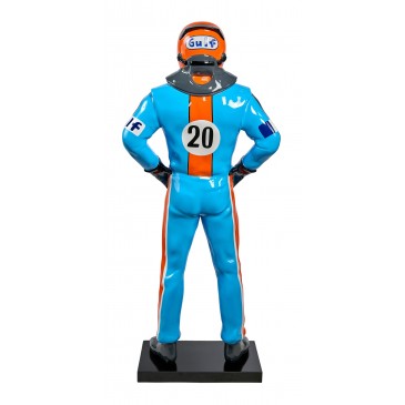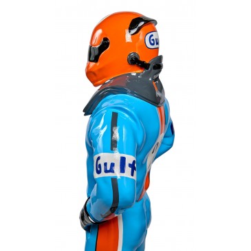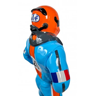 Sa combinaison arbore les célèbres couleurs bleu ciel et orange, avec le logo iconique sur la poitrine, clin d’œil aux voitures de légende qui ont marqué l’histoire du sport automobile. Les gants noirs et les bottes assorties apportent une finition élégante et contrastée.