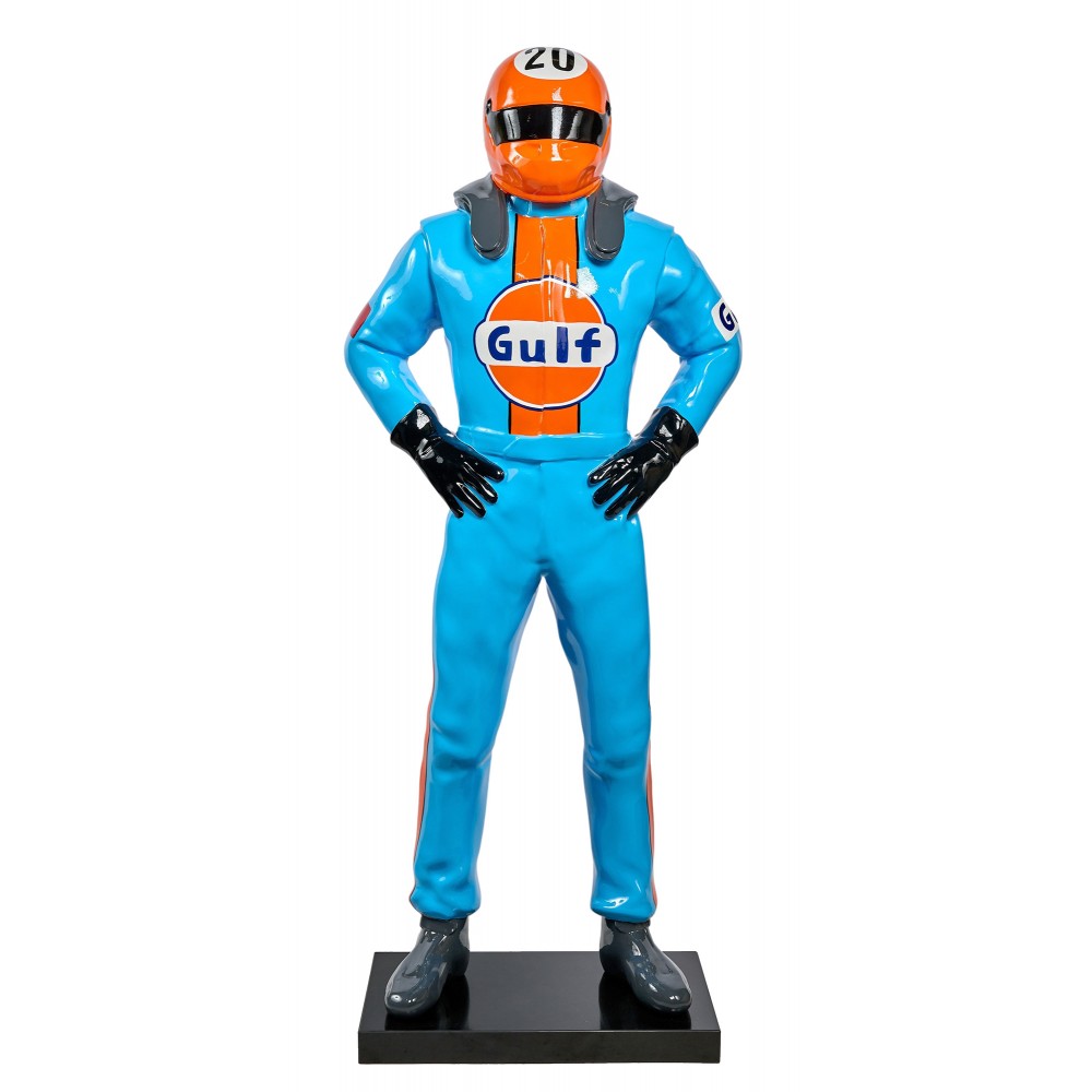 Cette statue en résine représente un pilote de course dans une posture fière et emblématique : debout, mains sur les hanches, casque intégral orange brillant et visière noire reflétant toute l’intensité de la compétition.