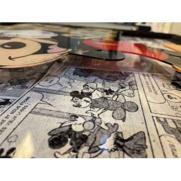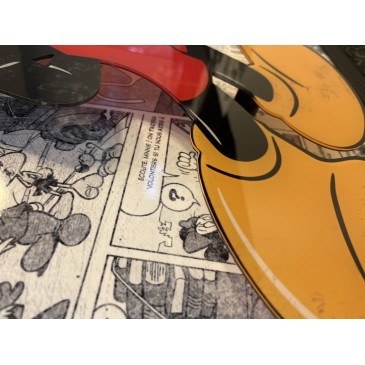 Ce tableau original, signé par la nouvelle artiste Émilie de Sène, met en scène un personnage iconique représenté en relief au premier plan. Ses couleurs vives (rouge, jaune et noir) tranchent avec le fond en noir et blanc composé de planches de bande dessinée, créant un effet de superposition et de collage saisissant.