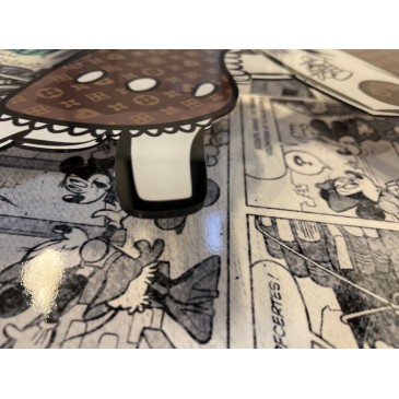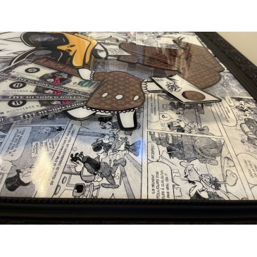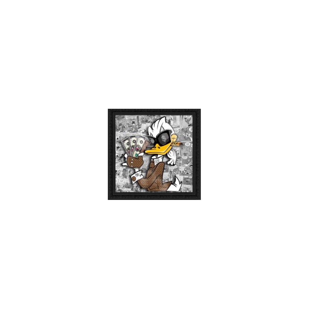 Ce tableau original, signé par la nouvelle artiste Émilie de Sène, met en scène le célèbre canard de cartoons représenté en relief. Habillé des motifs emblématiques de la maison de luxe L.V, il tient des dollars à la main et affiche une attitude provocatrice en fumant le cigare.